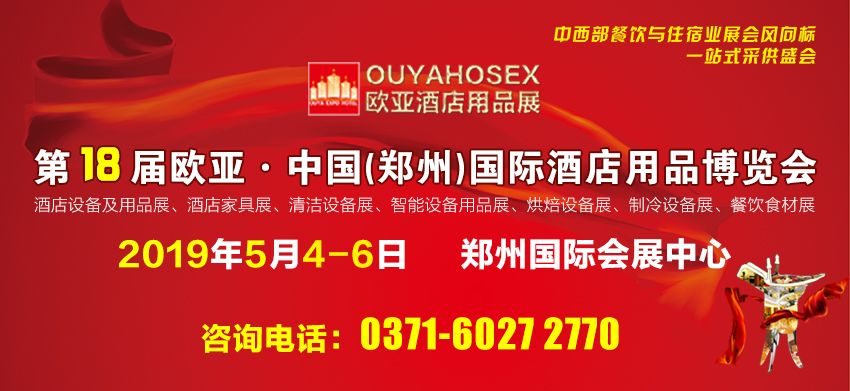 2019第18届欧亚中国(郑州)国际酒店用品博览会,将于2019年5月4-6日继续在郑州国际会展中心举办。同期将举办中部餐饮与住宿业发展高峰论坛;特色创新酒店用品应用研讨会暨新产品、新技术推介会;中部酒店业供需双方联谊会暨优秀酒店用品供应商颁奖典礼;中西部及华北地区酒店用品经销商对接大会等系列活动!