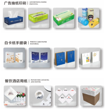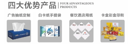 主要优势产品为: 广告纸抽定制、白卡手提袋订制印刷、餐饮酒店用纸、卡盒彩盒包装印刷四大业务板块!公司拥有先进的进口印刷设备和多台印后工艺设备,并拥有10余条纸抽分切、折叠、包装生产线和多台餐巾纸印刷设备,所代理的原纸有:维达、太阳、银鸽三大品牌,可满足不同客户订单的需求!