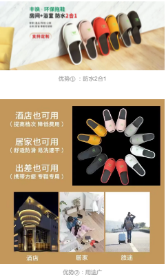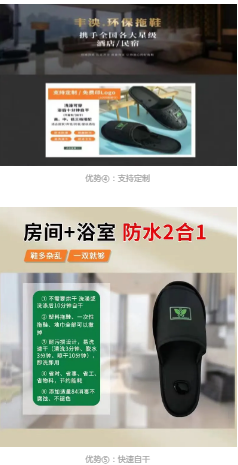 经过三年锲心开发,于2022年正式推出第一代防水2合1环保拖鞋,酒店一次性拖鞋、浴室塑料拖鞋、地巾全部可以撤掉,浴后十分钟自干不需要专门烘干,高、中、低三挡搭配,适合普通快捷一五星级不同档次的酒店,超强防滑(防滑全国联保),舒适度体验感极佳、外观颜色配比丰富、耐磨不褪色不起毛,酒店0库存、0垃圾,疫情之下可为酒店大幅降低相关费用·····