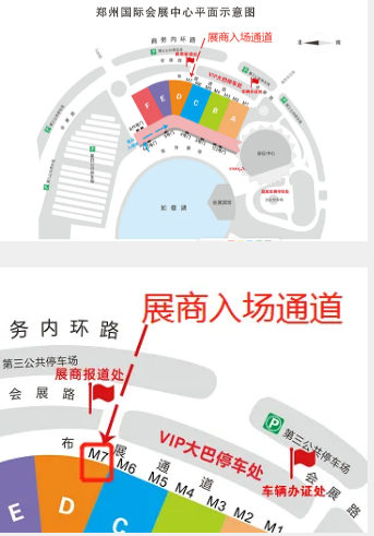 展商需前往郑州国际会展中心后方物流通道 M7 号门“展商报到处”,办理报到手续,并领取《参展证件》后方可进入展馆。